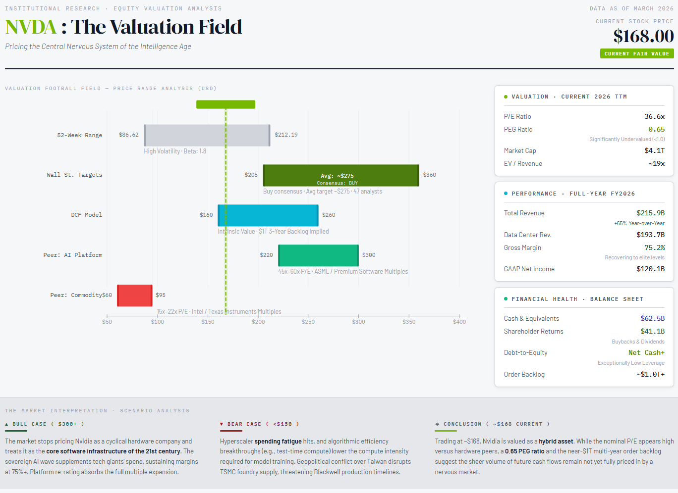 Forward Guidance & The Valuation Paradox: Despite the massive run in share price, the numbers tell a story of a company that is still growing into its suit. Trading at a Forward P/E of 36.6x, Nvidia remains remarkably attractive when paired with its 0.65 PEG Ratio. In a world where the “Central Bank of Compute” is guiding for a $1 trillion multi-year backlog, a 36x multiple for a company doubling its earnings is a rare anomaly in financial history.